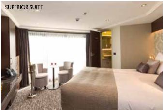 Want to take your cruise to the next level? Then why not upgrade to a superior suite. Substantially larger, these superior suites measure 19.5 sq. metres (210 sq. feet) with the extra space being used to expand the living area.